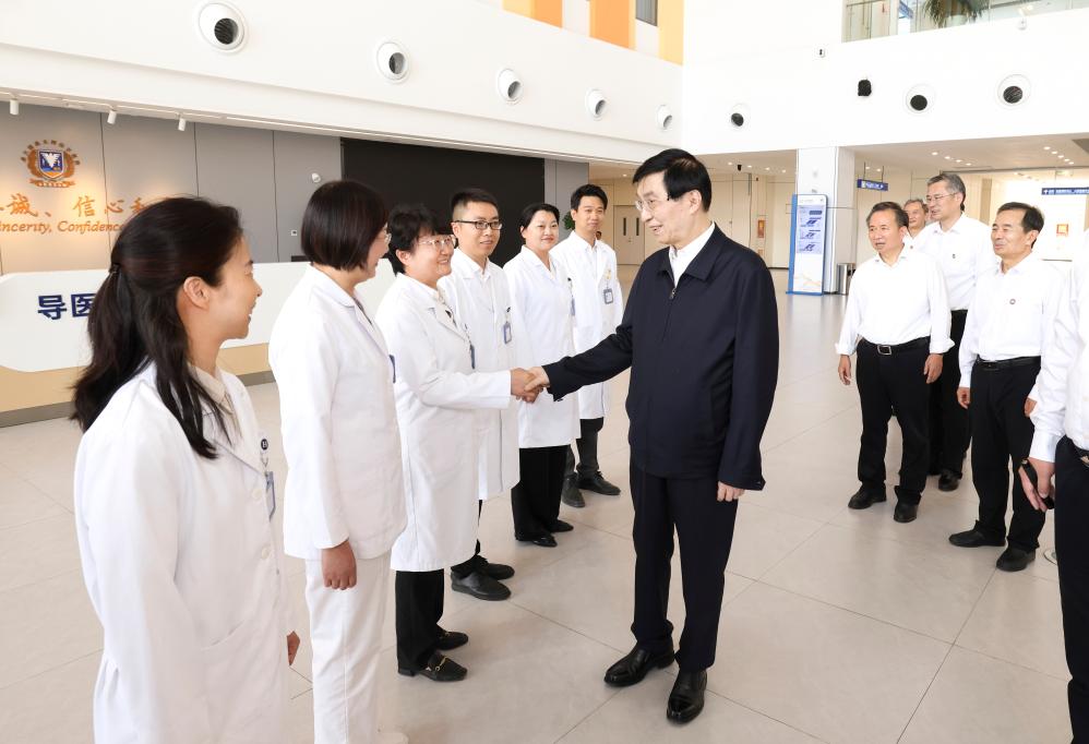Wang Huning, a member of the Standing Committee of the Political Bureau of the Communist Party of China Central Committee and chairman of the National Committee of the Chinese People's Political Consultative Conference, meets medical workers on pairing assistance program at Zhejiang University Sir Run Run Shaw Alaer Hospital in Alaer, northwest China's Xinjiang Uygur Autonomous Region, July 7, 2025. Wang attended a work conference focused on supporting Xinjiang through pairing assistance held in Hotan from Monday to Wednesday. Wang also made an inspection tour to Aksu, Hotan, Alaer and Kunyu during his visit to Xinjiang. (Xinhua/Pang Xinglei)