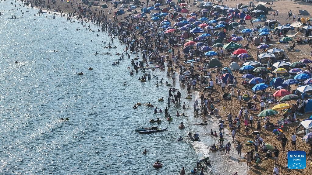 An aerial drone photo taken on July 10, 2025 shows a view of the beach of Fujiazhuang Park in Dalian, northeast China's Liaoning Province. Dalian has been experiencing continuous high temperatures in recent days. The beach of Fujiazhuang Park in Dalian attracted a large number of tourists to cool off. (Xinhua/Pan Yulong)