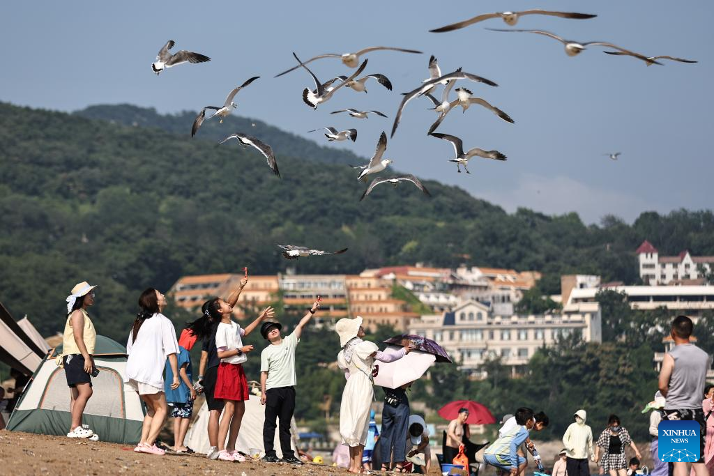Tourists feed seagulls on the beach of Fujiazhuang Park in Dalian, northeast China's Liaoning Province on July 10, 2025. Dalian has been experiencing continuous high temperatures in recent days. The beach of Fujiazhuang Park in Dalian attracted a large number of tourists to cool off. (Xinhua/Pan Yulong)