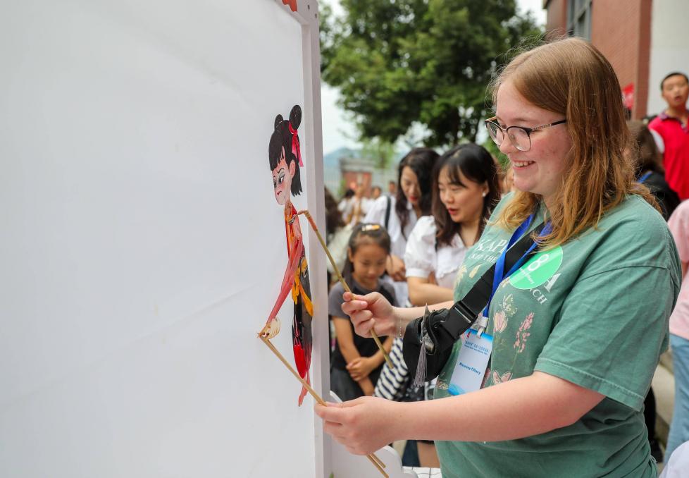 A student from the University of Tulsa in the United States plays shadow puppets at a school in Gaoxian county, Yibin, southwest China's Sichuan province, May 31, 2025. (Photo by Zhuang Ge'er/People's Daily Online)