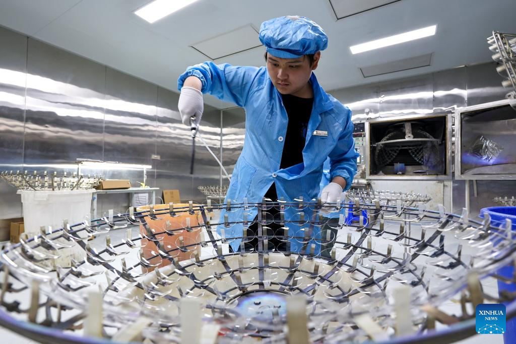 A staff member cleans the lenses after coating at the workshop of Keqiang Optics Co., Ltd. in Yujiang District of Yingtan, east China's Jiangxi Province, July 10, 2025. The eyewear industry is a traditional sector in Yujiang District, with sales organizations dating back to the Qing Dynasty (1644-1911). Today, Yujiang ranks among the top eyewear industry bases in China, attracting numerous well-known enterprises. From handcrafted eyewear over 200 years ago to the smart glasses today, Yujiang has written a centuries-long legend in the field of optics. (Xinhua/Liu Jinhai)