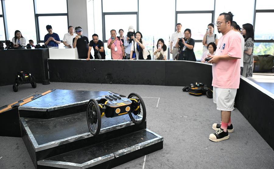 A staff member operates robot to climb stairs at a robot base in Dongguan, south China's Guangdong Province, June 23, 2025. (Xinhua/Deng Hua)