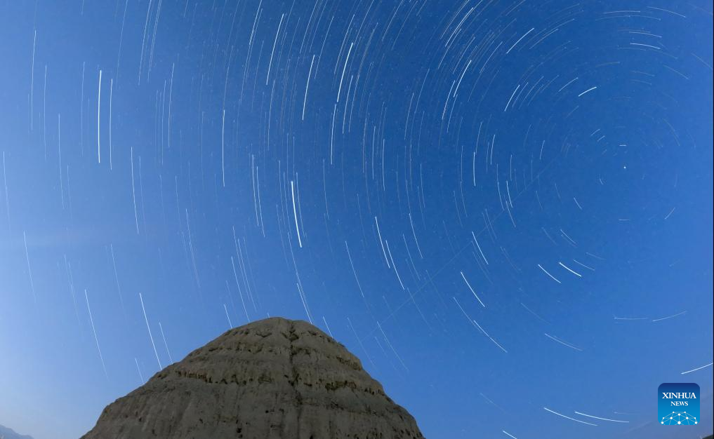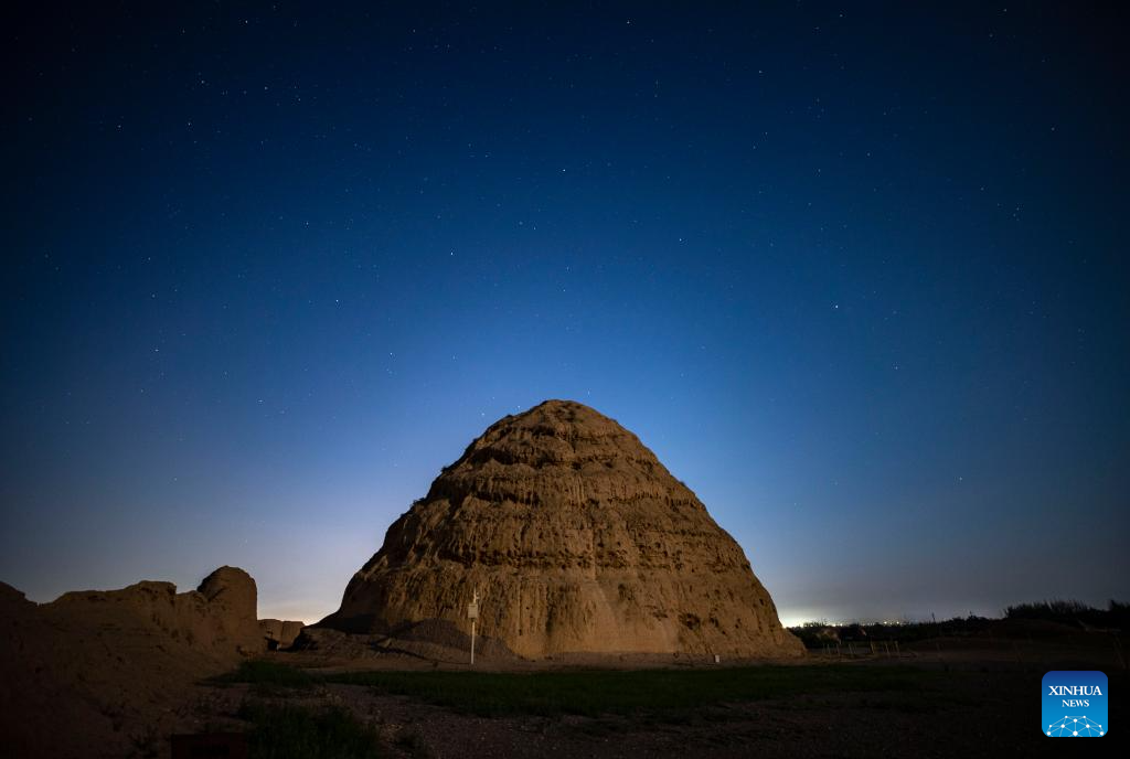 This photo taken on July 10, 2025 shows a Xixia imperial tomb under the stars in Yinchuan, northwest China's Ningxia Hui Autonomous Region. China's Xixia Imperial Tombs were officially added to the UNESCO World Heritage List on Friday during the 47th session of the World Heritage Committee held in Paris, France.The inscription brings the total number of World Heritage sites in China to 60. (Xinhua/Feng Kaihua)