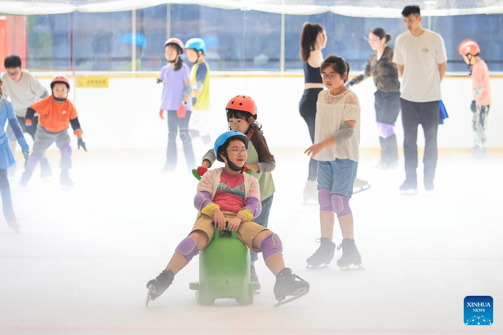 Children skate at an indoor rink in Nanjing, east China's Jiangsu Province, July 13, 2025. High temperature during the summer vacation has triggered new vitality of cooling economy across the country. (Photo by Su Yang/Xinhua)