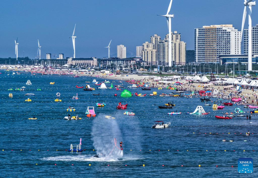 A drone photo taken on July 12, 2025 shows visitors enjoying themselves at a seaside scenic spot in Rongcheng City, east China's Shandong Province. High temperature during the summer vacation has triggered new vitality of cooling economy across the country. (Photo by Li Xinjun/Xinhua)