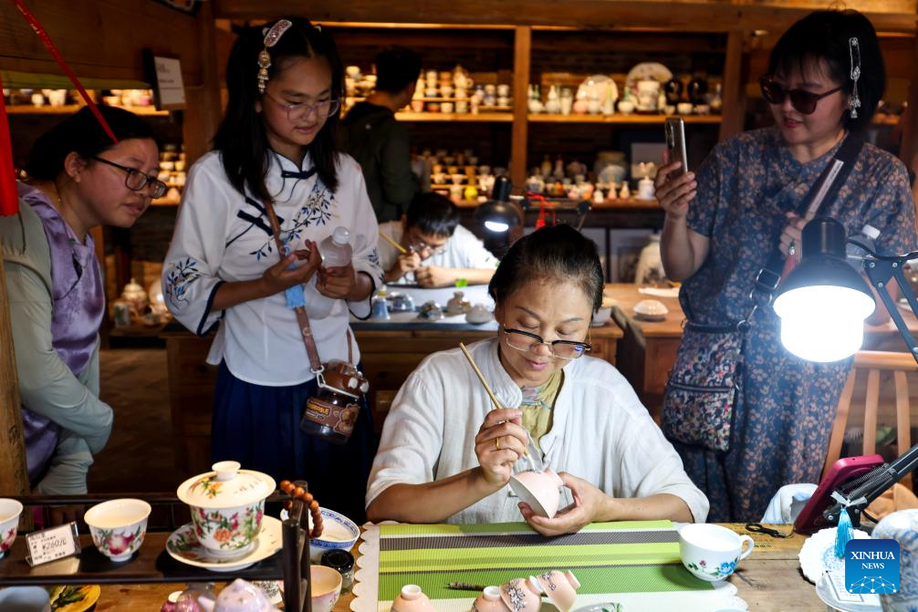 An artisan makes a ceramic product in Taoyangli historical and cultural block in Jingdezhen City, east China's Jiangxi Province, July 13, 2025. Located in the heart of Jingdezhen, Taoyangli has successfully transformed from an old district into a thriving hub for cultural innovation and tourism in recent years. Today, it has become a must-visit destination for tourists. (Xinhua/Liu Jinhai)