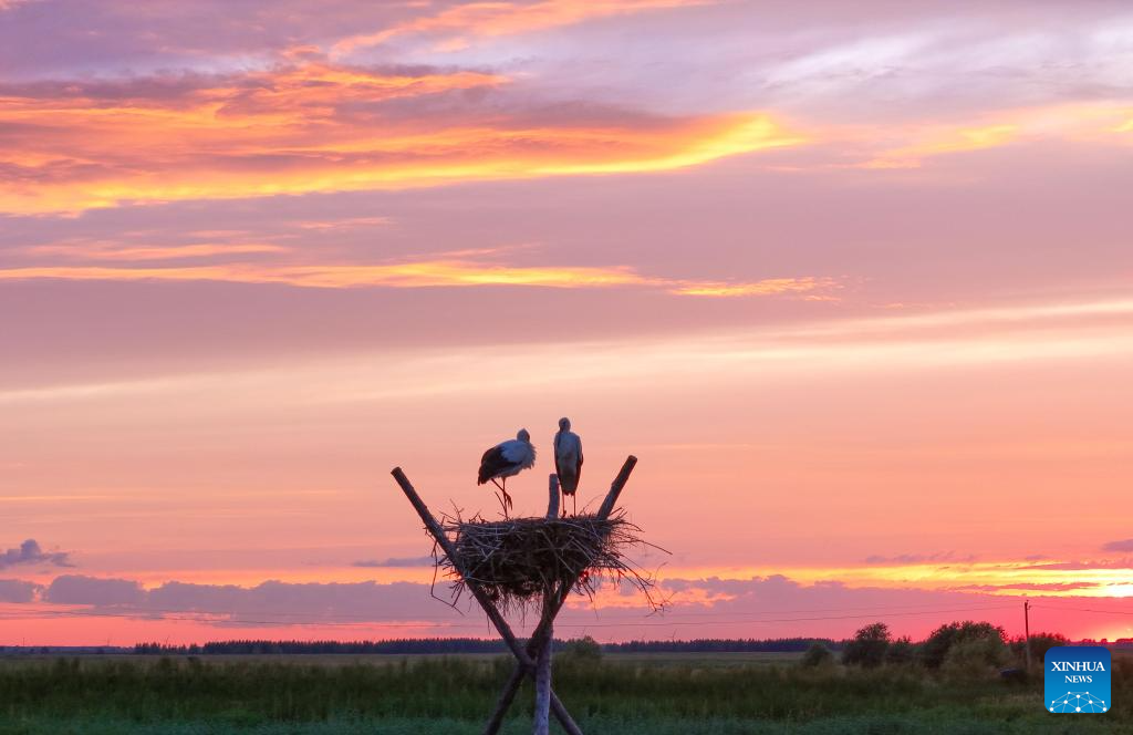 A drone photo taken on July 13, 2025 shows oriental white storks in an artificial nest at Sanhuanpao National Nature Reserve, in Fujin City, northeast China's Heilongjiang Province. Midsummer is the typical fledging season for oriental white stork chicks, which will later leave their parents.