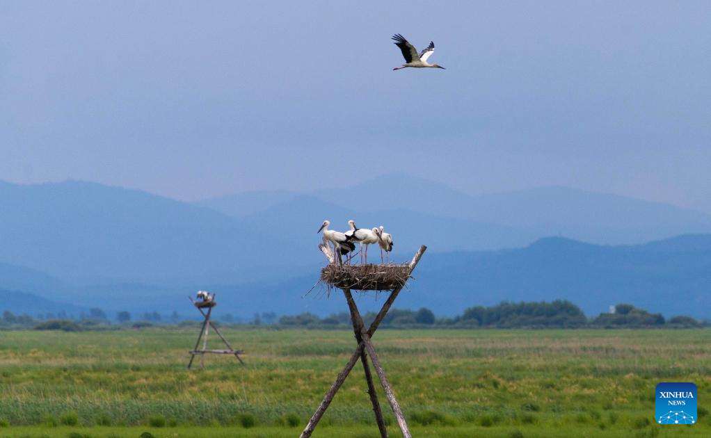 In pics: oriental white storks in artificial nests in Fujin City, NE China
