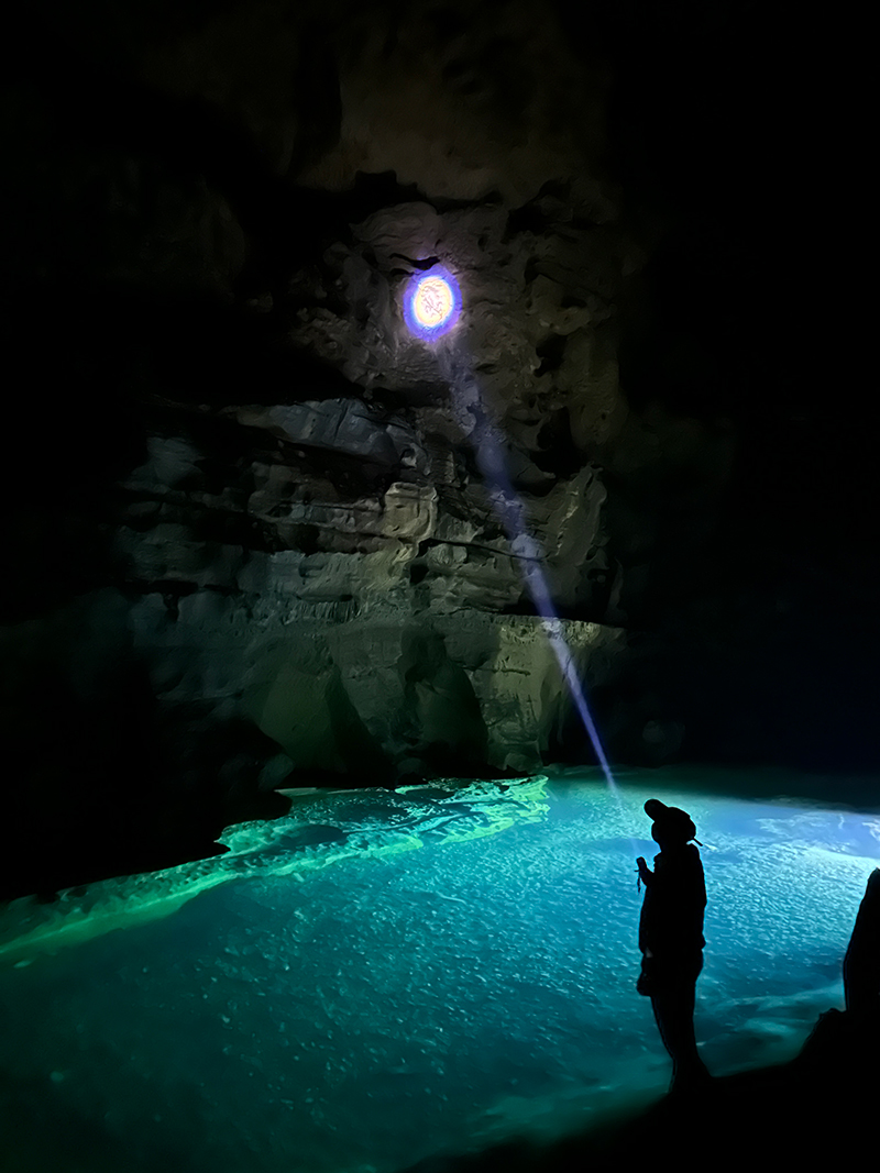 Following a winding path past towering stalactites and trickling underground streams deep inside a serene karst cave at Jinzhong Mountain tourist resort, visitors can find a circular opening in the cave ceiling that connects directly to the surface.