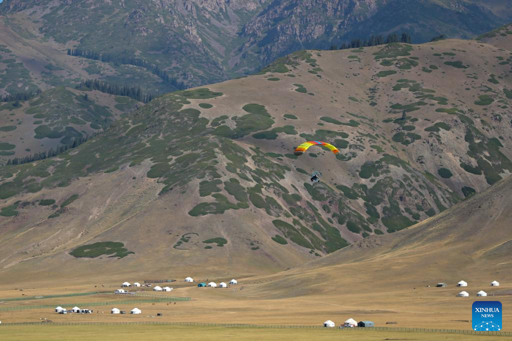 Tourists experience electric paragliding at the Sayram Lake scenic area in Bortala Mongolian Autonomous Prefecture, northwest China's Xinjiang Uygur Autonomous Region, July 17, 2025. Nestled in the Tianshan Mountains, Sayram Lake, Xinjiang's highest and largest alpine lake, has entered its peak tourist season in midsummer. (Xinhua/Wang Jingqiang)
