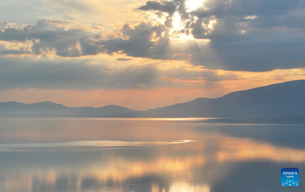 An aerial drone photo taken on July 17, 2025 shows the scenery of Sayram Lake in Bortala Mongolian Autonomous Prefecture, northwest China's Xinjiang Uygur Autonomous Region. Nestled in the Tianshan Mountains, Sayram Lake, Xinjiang's highest and largest alpine lake, has entered its peak tourist season in midsummer. (Photo by Zhang Limin/Xinhua)