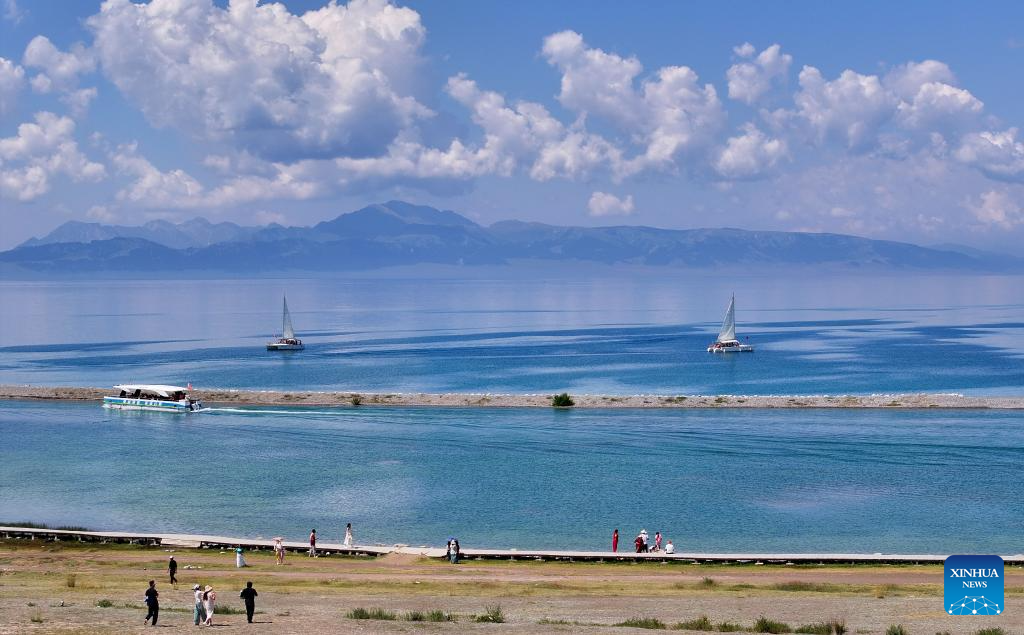 This photo taken on July 17, 2025 shows the scenery of Sayram Lake in Bortala Mongolian Autonomous Prefecture, northwest China's Xinjiang Uygur Autonomous Region. Nestled in the Tianshan Mountains, Sayram Lake, Xinjiang's highest and largest alpine lake, has entered its peak tourist season in midsummer. (Photo by Zhang Limin/Xinhua)
