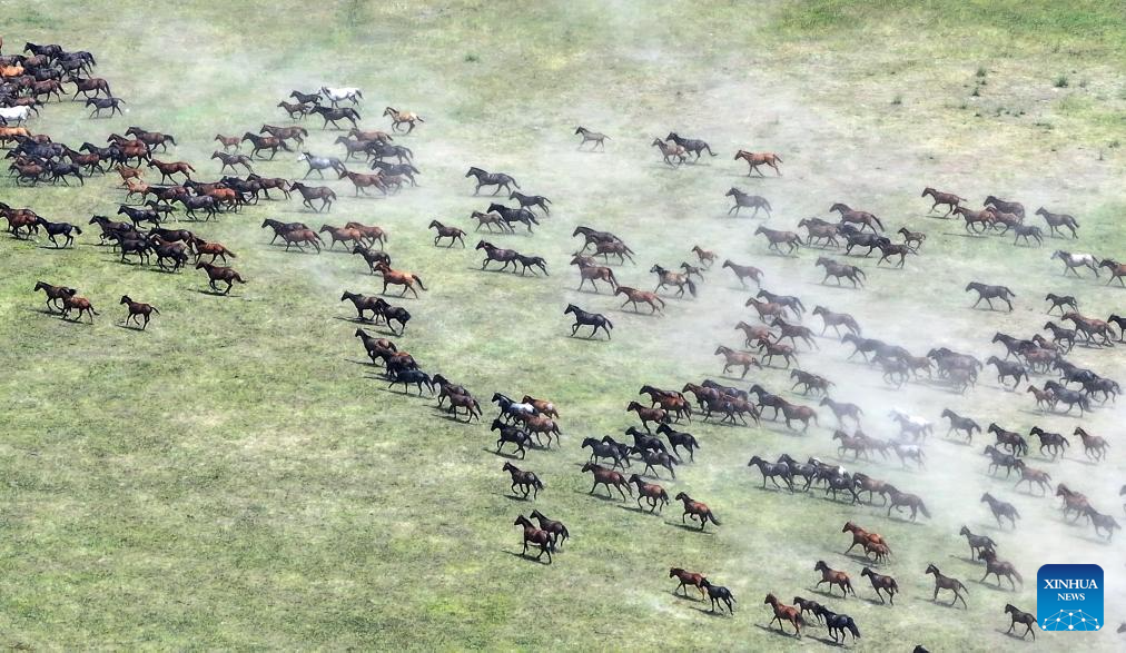 An aerial drone photo taken on July 19, 2025 shows horses running during a tourism festival in Zhaosu, northwest China's Xinjiang Uygur Autonomous Region. (Photo by Zhang Limin/Xinhua)