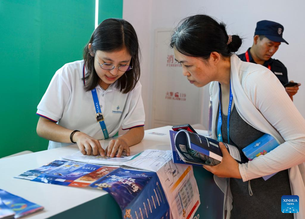 A volunteer provides services for a visitor at the third China International Supply Chain Expo (CISCE) in Beijing, capital of China, July 20, 2025. Volunteers from universities like Central University of Finance and Economics, Beijing Foreign Studies University, Minzu University of China, and Beijing International Studies University are involved in the third CISCE, which scheduled from July 16 to 20. (Xinhua/Chen Shuo)