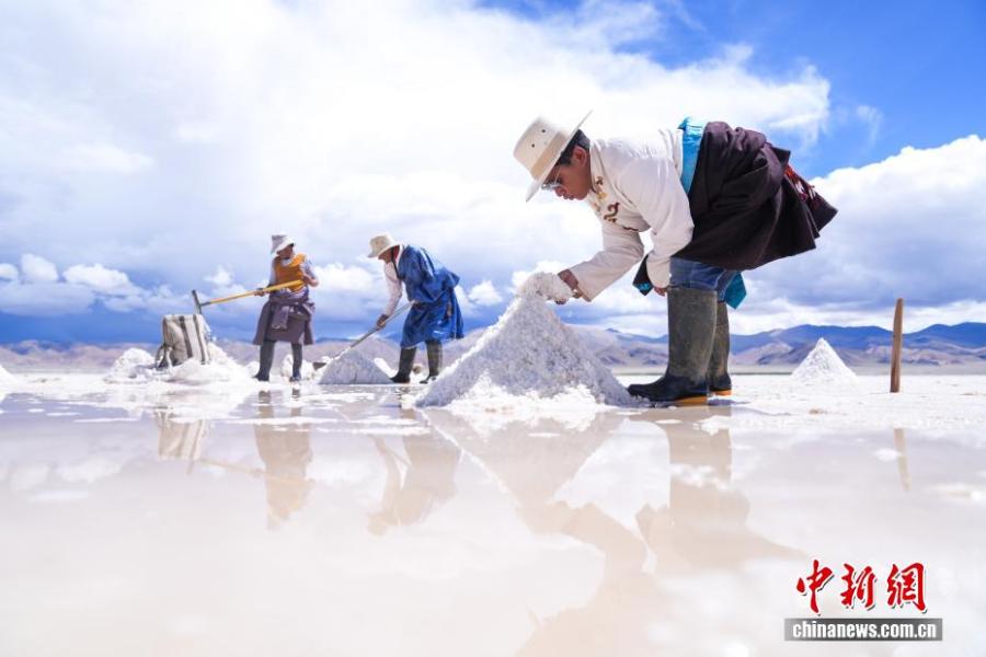 People collect crude salt in a salt lake in Yanhu Township, Geji County, Ali Prefecture, Xizang Autonomous Region, July 20, 2025. (Photo: China News Service/Zhang Xiangyi)