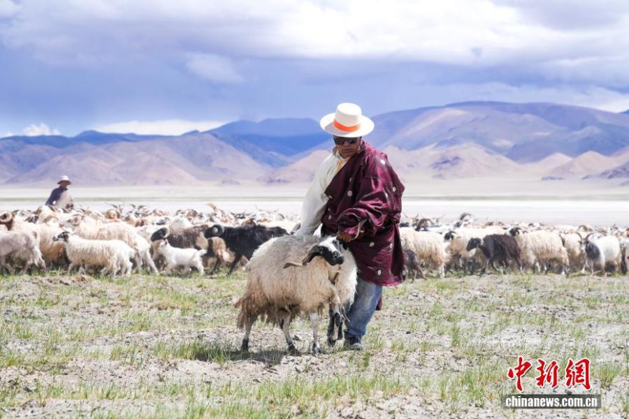 A herder pulls a sheep to carry a bag of salt in Yanhu Township, Geji County, Ali Prefecture, Xizang Autonomous Region, July 20, 2025. (Photo: China News Service/Zhang Xiangyi)