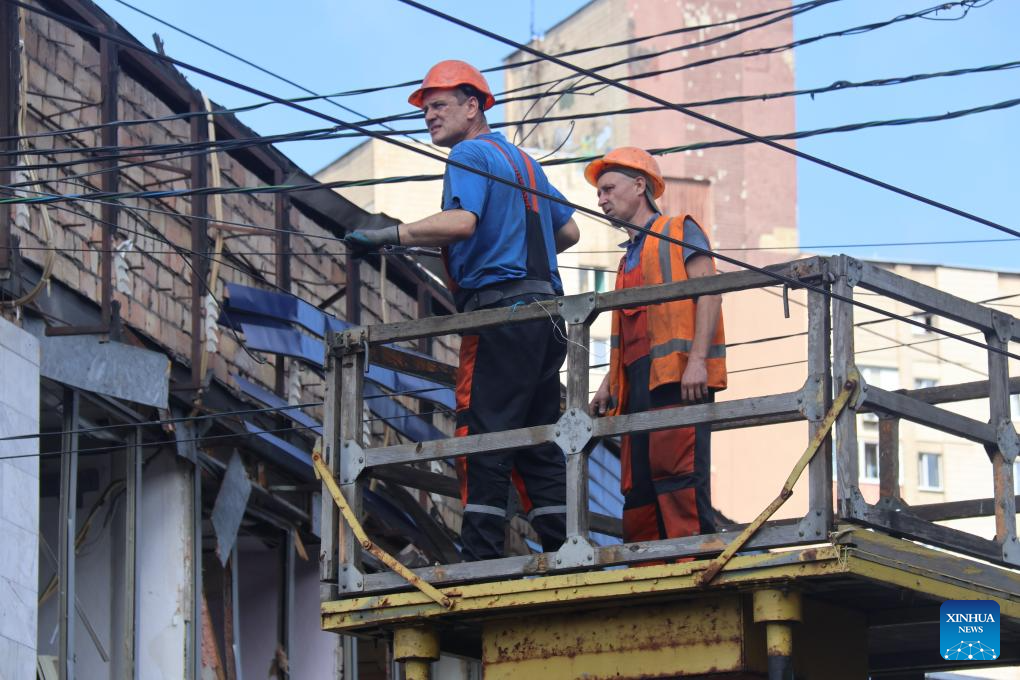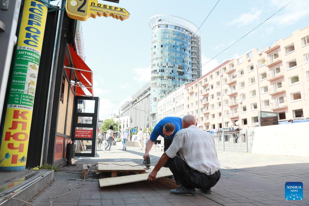 People cut a board to fix damaged doors and windows after an air strike in Kiev, Ukraine, July 21, 2025. Two people were killed and 15 others injured in a wave of Russian missile and drone strikes on Ukraine's capital and the western region of Ivano-Frankivsk early Monday, said Ukrainian authorities.