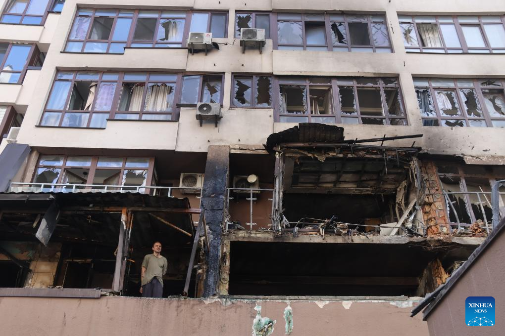 A man stands on the balcony of a damaged residential building in the Shevchenkivskyi district of Kiev, Ukraine, July 21, 2025. Two people were killed and 15 others injured in a wave of Russian missile and drone strikes on Ukraine's capital and the western region of Ivano-Frankivsk early Monday, said Ukrainian authorities.