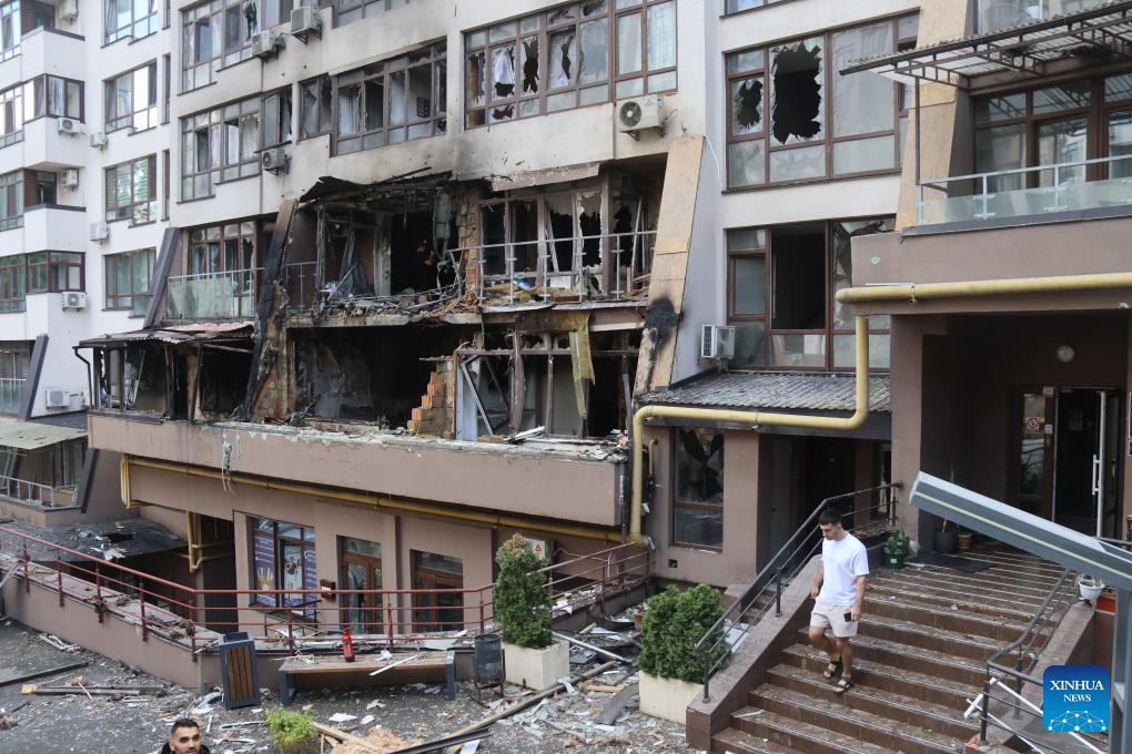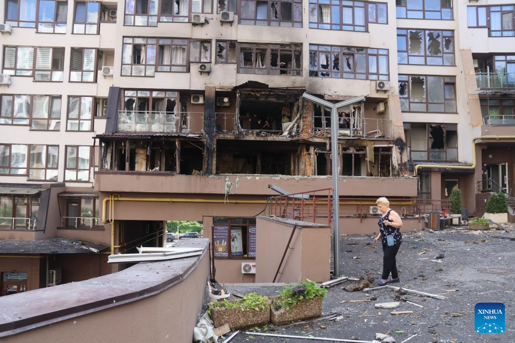 A damaged residential building is pictured after an air strike in the Shevchenkivskyi district of Kiev, Ukraine, July 21, 2025. Two people were killed and 15 others injured in a wave of Russian missile and drone strikes on Ukraine's capital and the western region of Ivano-Frankivsk early Monday, said Ukrainian authorities.