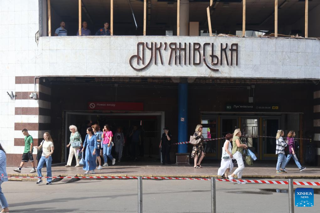 People evacuate from a metro station damaged by an air strike in the Shevchenkivskyi district of Kiev, Ukraine, July 21, 2025. Two people were killed and 15 others injured in a wave of Russian missile and drone strikes on Ukraine's capital and the western region of Ivano-Frankivsk early Monday, said Ukrainian authorities.