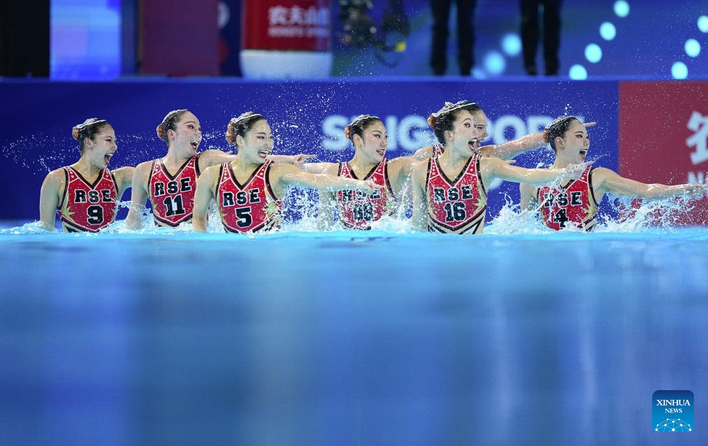 Team Japan perform during the team technical final of artistic swimming at the World Aquatics Championships in Singapore, July 22, 2025. (Xinhua/Xia Yifang)