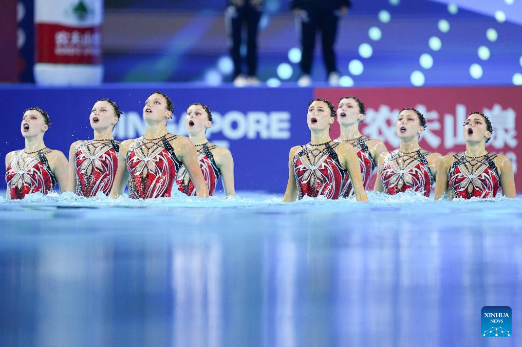 Team Ukraine perform during the team technical final of artistic swimming at the World Aquatics Championships in Singapore, July 22, 2025. (Xinhua/Xia Yifang)