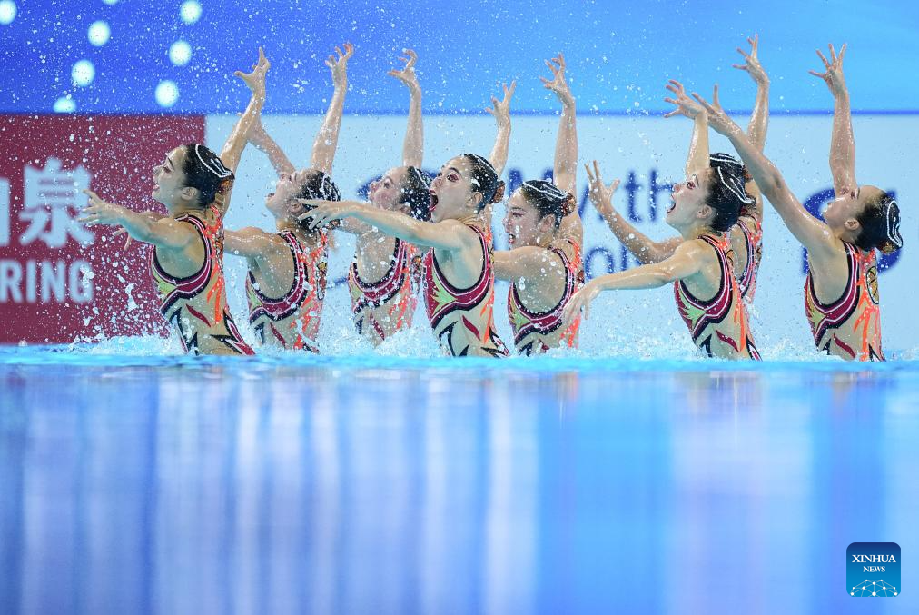 Team Spain compete during the team technical final of artistic swimming at the World Aquatics Championships in Singapore, July 22, 2025. (Xinhua/Xia Yifang)