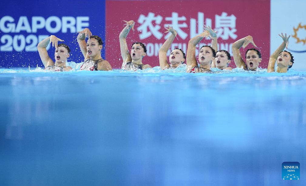 Team Canada perform during the team technical final of artistic swimming at the World Aquatics Championships in Singapore, July 22, 2025. (Xinhua/Xia Yifang)