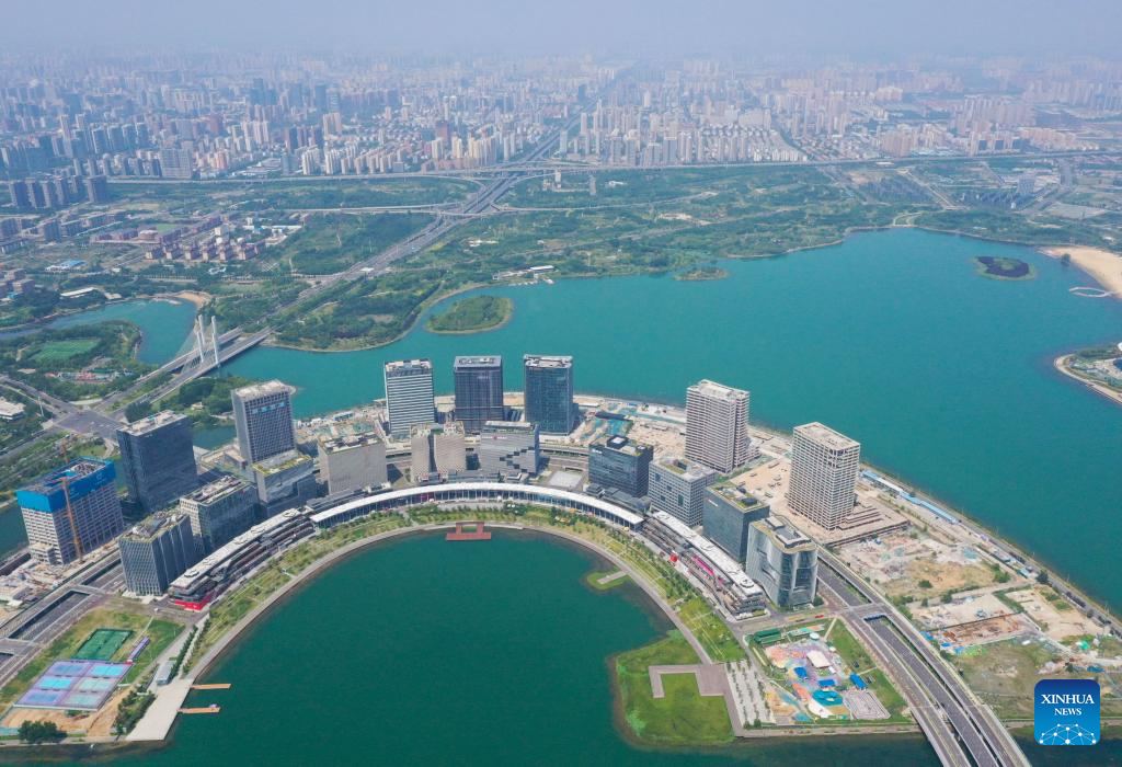 An aerial drone photo taken on July 15, 2025 shows a financial island in Zhengzhou, central China's Henan Province. Located in central China, Zhengzhou is renowned as a regional hub for sci-tech innovation, a national historical and cultural city, and an international comprehensive transportation hub. In recent years, Zhengzhou has been dedicated to promoting high-quality development, enhancing its overall competitiveness, and integrating into the national market.