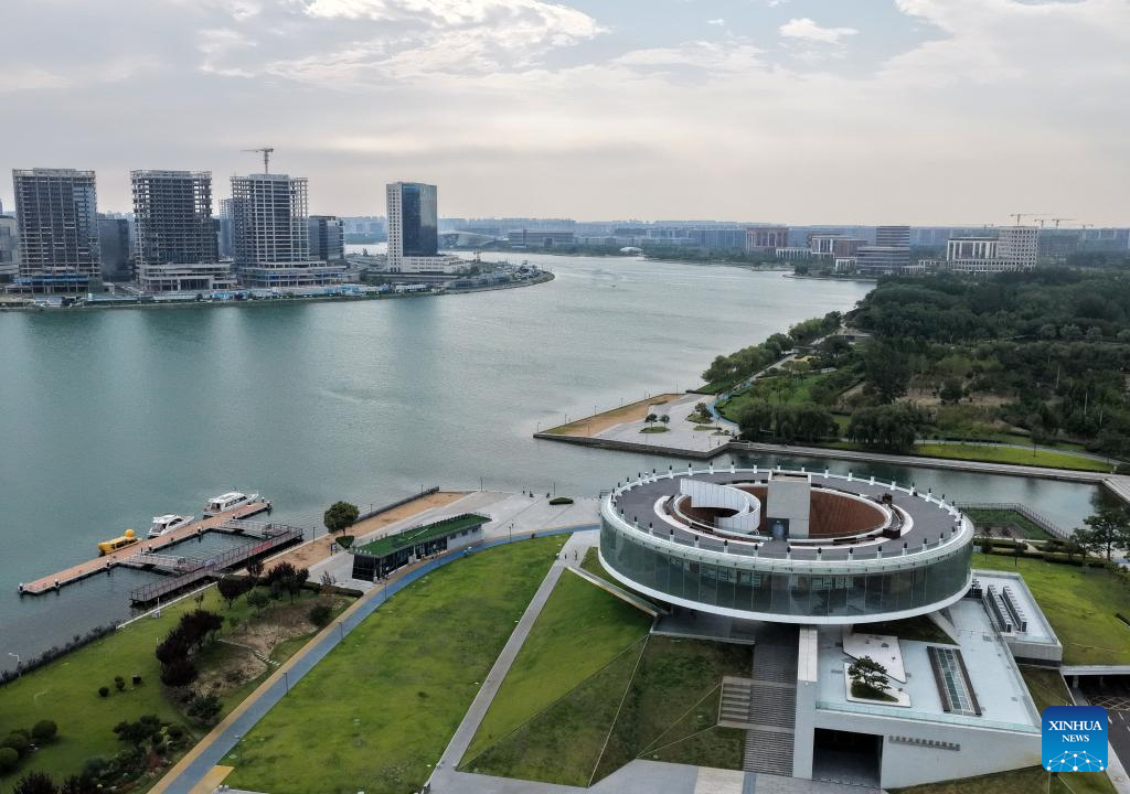 An aerial drone photo taken on July 16, 2025 shows a wetland park in Zhengzhou, central China's Henan Province. Located in central China, Zhengzhou is renowned as a regional hub for sci-tech innovation, a national historical and cultural city, and an international comprehensive transportation hub. In recent years, Zhengzhou has been dedicated to promoting high-quality development, enhancing its overall competitiveness, and integrating into the national market.