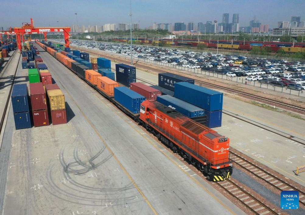 An aerial drone photo taken on April 15, 2025 shows a China-Europe freight train at Putian Station in Zhengzhou, central China's Henan Province. Located in central China, Zhengzhou is renowned as a regional hub for sci-tech innovation, a national historical and cultural city, and an international comprehensive transportation hub. In recent years, Zhengzhou has been dedicated to promoting high-quality development, enhancing its overall competitiveness, and integrating into the national market.