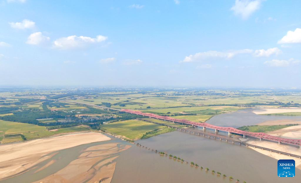 An aerial drone photo taken on July 17, 2025 shows a section of the Yellow River in Zhengzhou, central China's Henan Province. Located in central China, Zhengzhou is renowned as a regional hub for sci-tech innovation, a national historical and cultural city, and an international comprehensive transportation hub. In recent years, Zhengzhou has been dedicated to promoting high-quality development, enhancing its overall competitiveness, and integrating into the national market.
