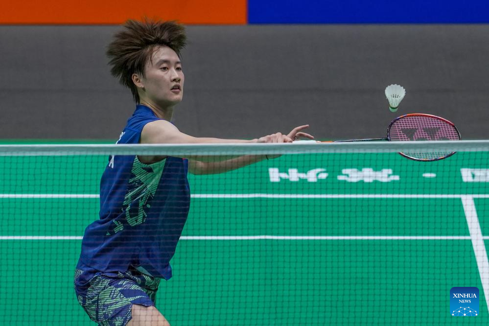 Han Yue of China competes during the women's singles round of 32 match between Han Yue of China and Nidaira Natsuki of Japan at the China Open 2025 badminton tournament in Changzhou, east China's Jiangsu Province, July 22, 2025. (Xinhua/Li Bo)