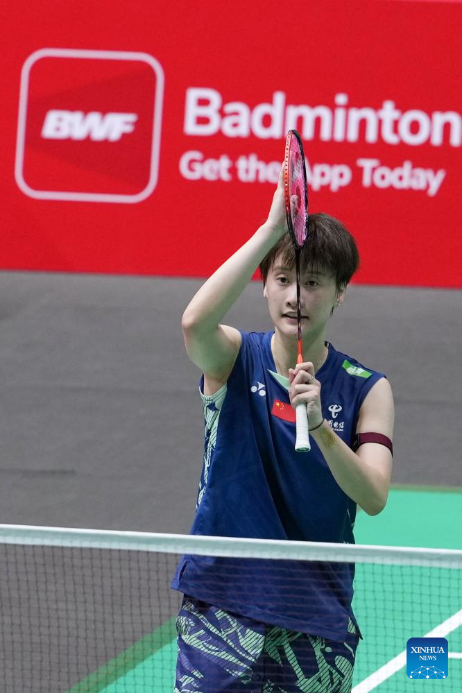 Gao Fangjie of China competes during the women's singles round of 32 match between Gao Fangjie of China and Julie Dawall Jakobsen of Denmark at the China Open 2025 badminton tournament in Changzhou, east China's Jiangsu Province, July 22, 2025. (Xinhua/Li Bo)