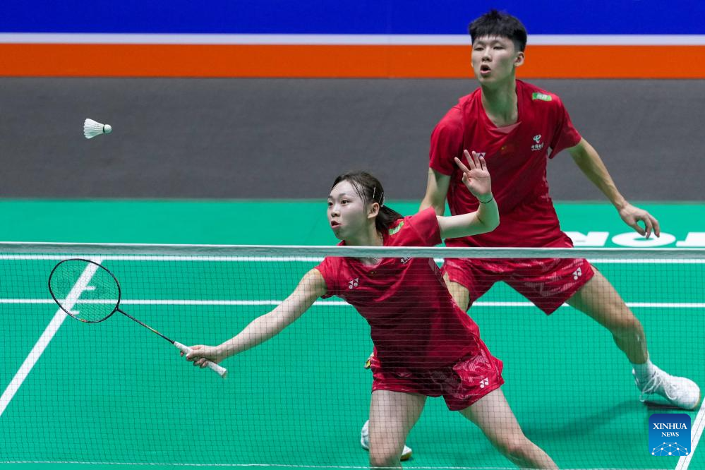 Guo Xinwa/Chen Fanghui (R) of China compete during the mixed doubles round of 32 match between Guo Xinwa/Chen Fanghui of China and Jesper Toft/Amalie Magelund of Denmark at the China Open 2025 badminton tournament in Changzhou, east China's Jiangsu Province, July 22, 2025. (Xinhua/Li Bo)