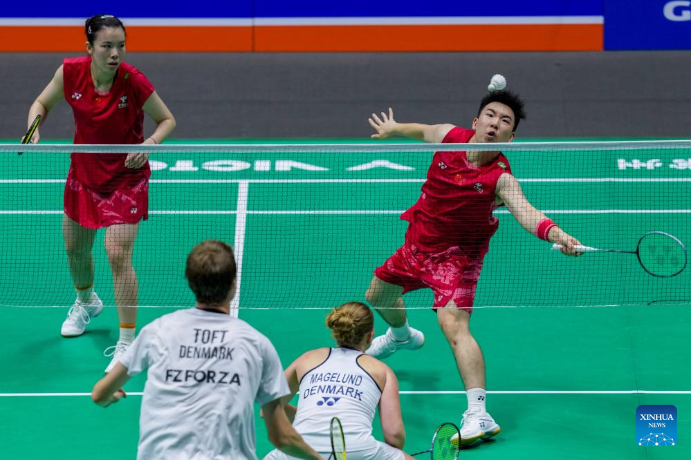 Jesper Toft/Amalie Magelund (R) of Denmark compete during the mixed doubles round of 32 match between Guo Xinwa/Chen Fanghui of China and Jesper Toft/Amalie Magelund of Denmark at the China Open 2025 badminton tournament in Changzhou, east China's Jiangsu Province, July 22, 2025. (Xinhua/Li Bo)