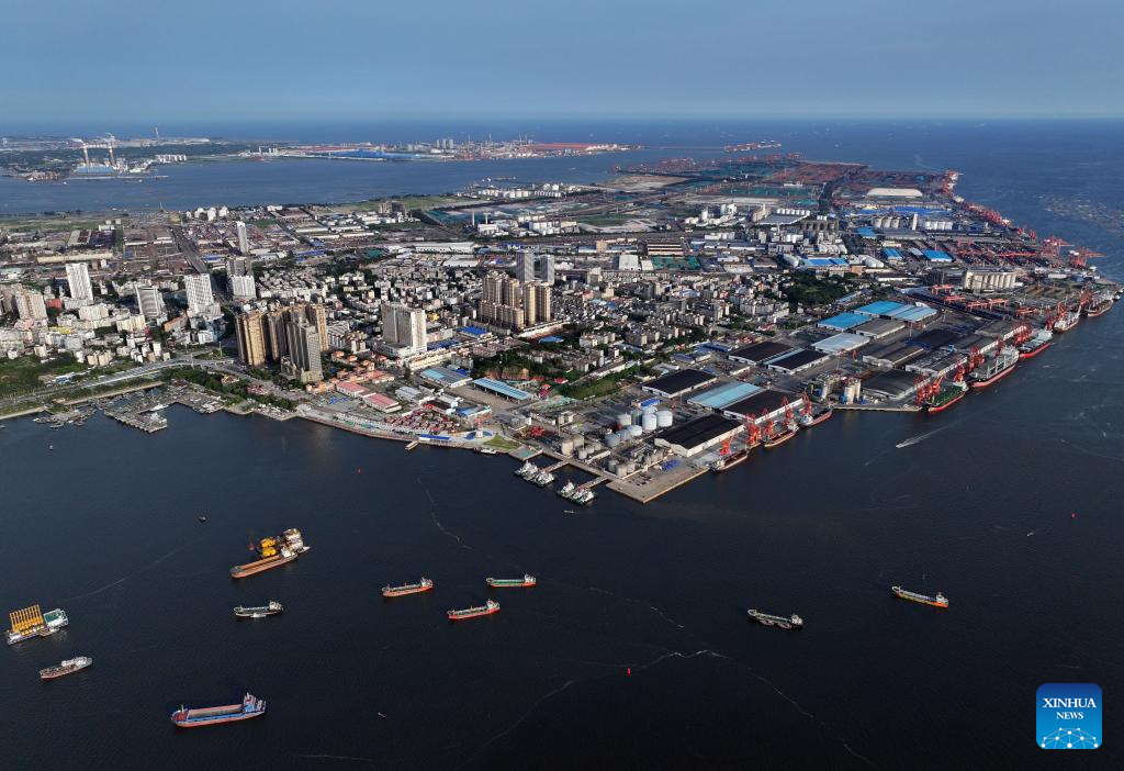 An aerial drone photo taken on July 6, 2025 shows a view of Fangchenggang Port in Fangchenggang City, south China's Guangxi Zhuang Autonomous Region. Fangchenggang, named after its port, is located at the China-Vietnam border and serves as a crucial hub of the New International Land-Sea Trade Corridor. The city is also situated on the shoreline of the Beibu Gulf and features seaside tourist attractions such as piers and beaches. (Xinhua/Huang Xiaobang)