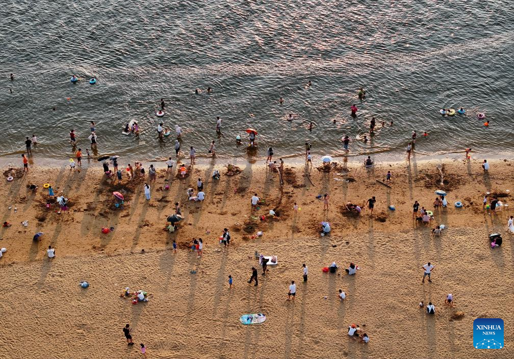 People enjoy their leisure time on a beach at a scenic area in Fangchenggang City, south China's Guangxi Zhuang Autonomous Region, July 6, 2025. Fangchenggang, named after its port, is located at the China-Vietnam border and serves as a crucial hub of the New International Land-Sea Trade Corridor. The city is also situated on the shoreline of the Beibu Gulf and features seaside tourist attractions such as piers and beaches. (Xinhua/Huang Xiaobang)