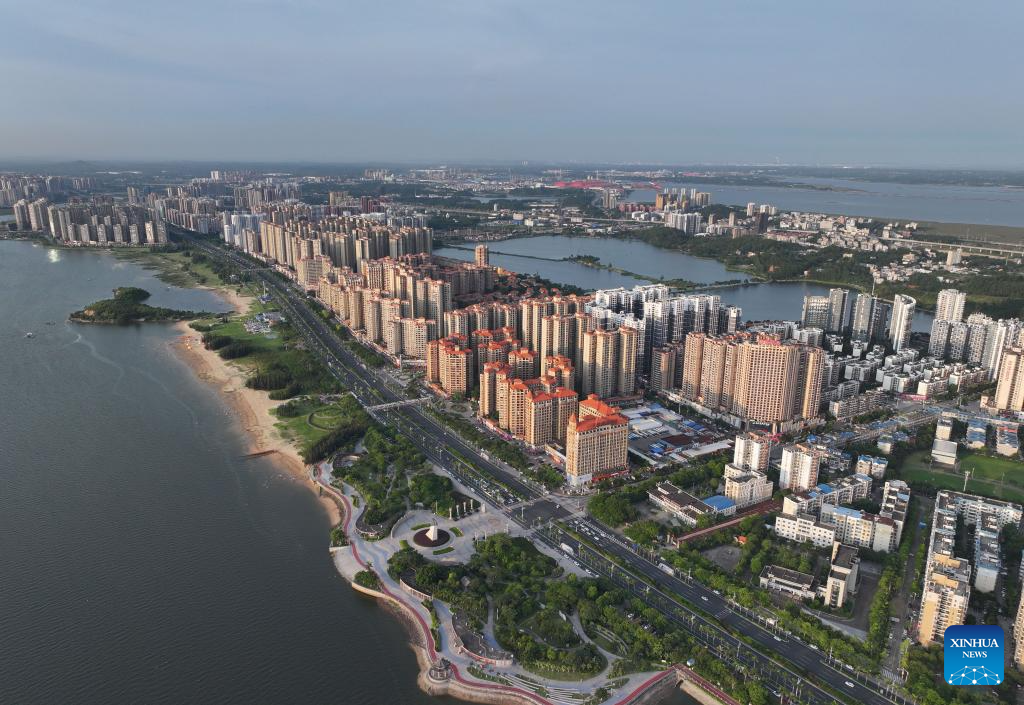 An aerial drone photo taken on July 6, 2025 shows a view of Fangchenggang City, south China's Guangxi Zhuang Autonomous Region. Fangchenggang, named after its port, is located at the China-Vietnam border and serves as a crucial hub of the New International Land-Sea Trade Corridor. The city is also situated on the shoreline of the Beibu Gulf and features seaside tourist attractions such as piers and beaches. (Xinhua/Huang Xiaobang)