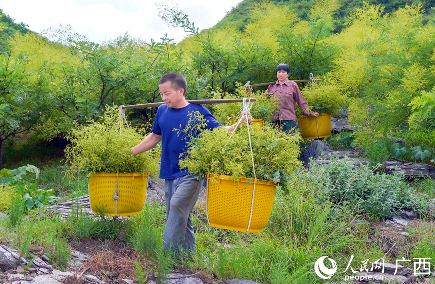 Farmers carry golden Chinese scholar tree flowers in Baibao township, Quanzhou county, Guilin city, south China's Guangxi Zhuang Autonomous Region. (Photo/People's Daily Online)