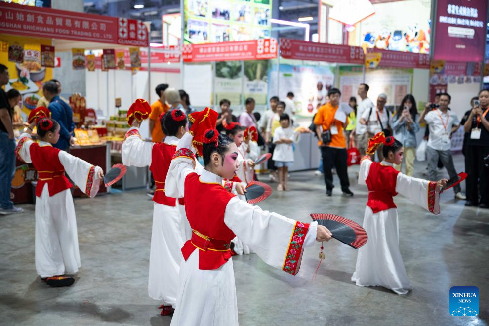 Performers dance during the 2025 Guangdong and Macao Branded Products Fair in Macao, south China, July 24, 2025. The 2025 Guangdong and Macao Branded Products Fair opened Thursday in China's Macao Special Administrative Region (SAR), highlighting "silver economy" and the "China-chic" cultural trends.(Photo by Cheong Kam Ka/Xinhua)