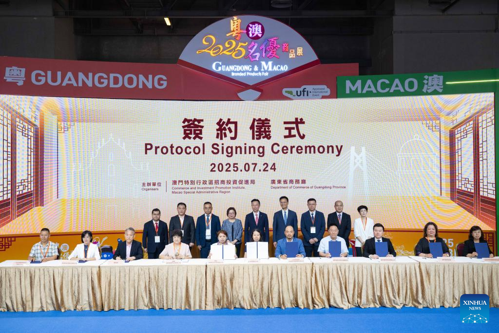 A protocol signing ceremony is held during the 2025 Guangdong and Macao Branded Products Fair in Macao, south China, July 24, 2025. The 2025 Guangdong and Macao Branded Products Fair opened Thursday in China's Macao Special Administrative Region (SAR), highlighting "silver economy" and the "China-chic" cultural trends.(Photo by Cheong Kam Ka/Xinhua)
