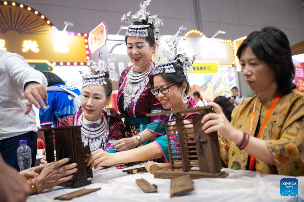 Participants communicate during the 2025 Guangdong and Macao Branded Products Fair in Macao, south China, July 24, 2025. The 2025 Guangdong and Macao Branded Products Fair opened Thursday in China's Macao Special Administrative Region (SAR), highlighting "silver economy" and the "China-chic" cultural trends.(Photo by Cheong Kam Ka/Xinhua)