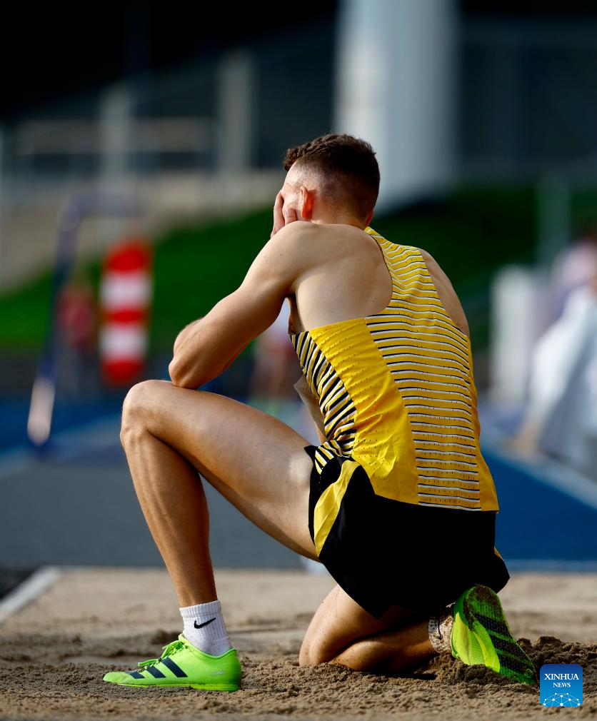 Simon Batz of Germany reacts during the men's long jump final at the Rhine-Ruhr 2025 FISU World University Games in Bochum, Germany, July 24, 2025. (Xinhua/Li Ying)
