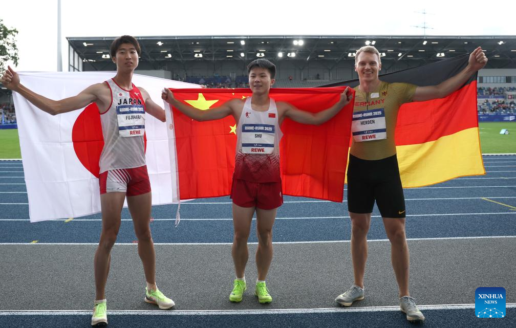 Gold medalist Shu Heng (C) of China poses with silver medalist Fujihara Koki (L) of Japan, bronze medalist Luka Herden of Germany during the awarding ceremony for the men's long jump final at the Rhine-Ruhr 2025 FISU World University Games in Bochum, Germany, July 24, 2025. (Xinhua/Hu Xingyu)