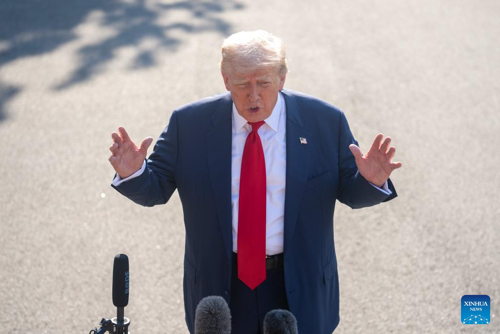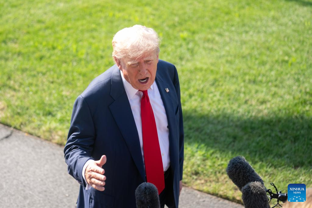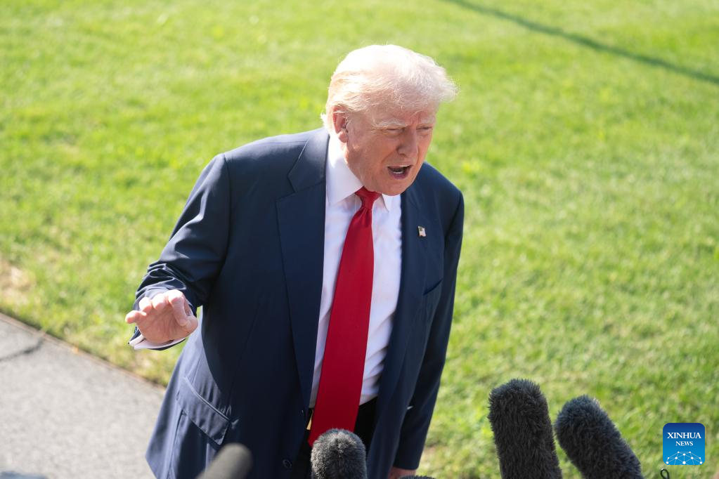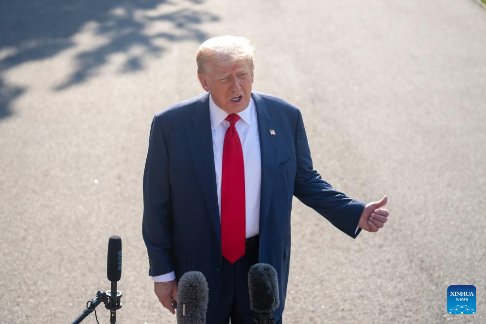 U.S. President Donald Trump speaks to reporters before his departure for the United Kingdom at the White House in Washington, D.C., the United States, on July 25, 2025. (Xinhua/Hu Yousong)