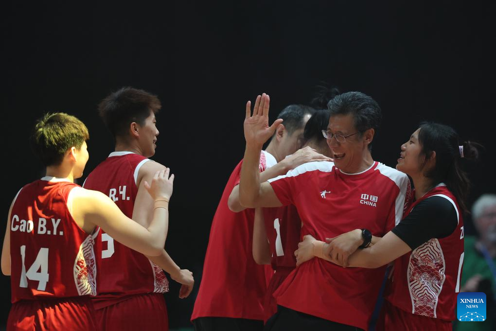 Players of team China celebrate during the women's basketball final between China and the United States at the Rhine-Ruhr 2025 FISU World University Games in Essen, Germany, July 25, 2025. (Xinhua/Zhang Chen)