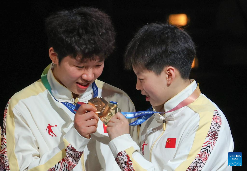 Cao Boyi (R) and Chen Yujie of team China celebrate during the women's basketball final between China and the United States at the Rhine-Ruhr 2025 FISU World University Games in Essen, Germany, July 25, 2025. (Xinhua/Zhang Fan)