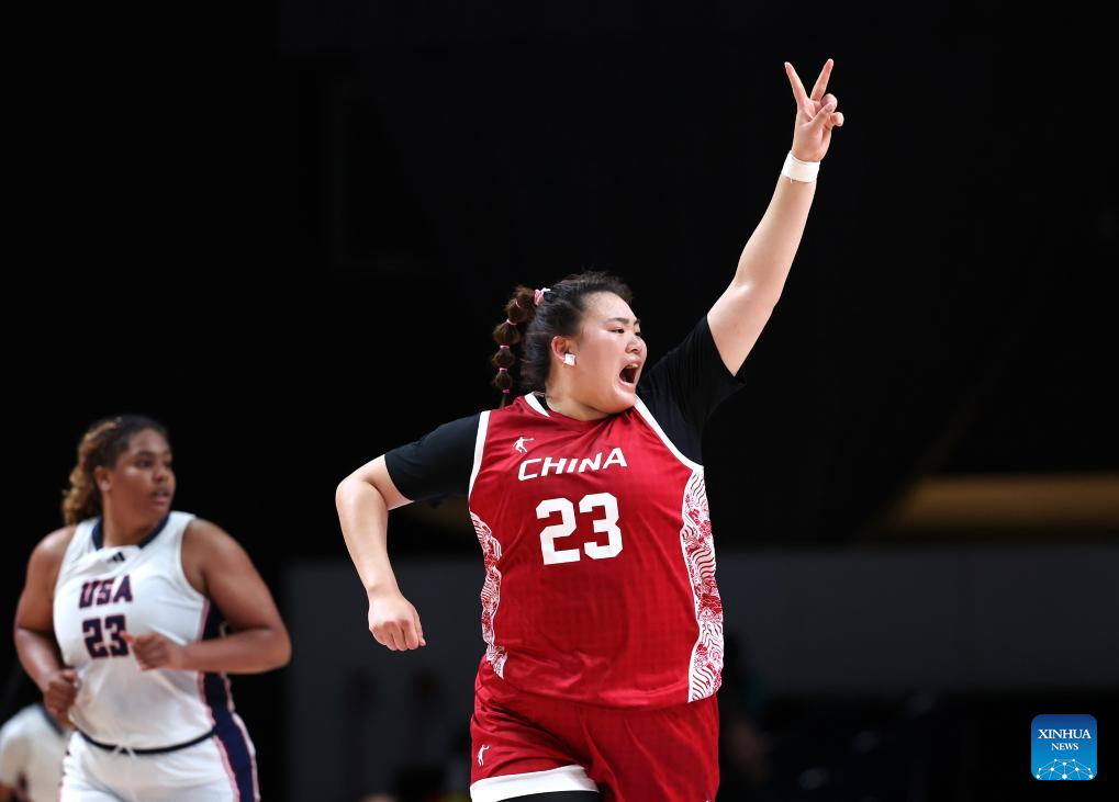 Liu Yutong (C) of China reacts during the women's basketball final between China and the United States at the Rhine-Ruhr 2025 FISU World University Games in Essen, Germany, July 25, 2025. (Xinhua/Zhang Fan)