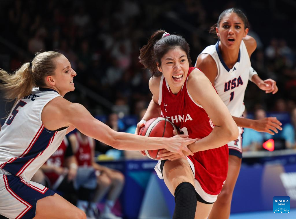 Cao Boyi (Front) of China breaks through during the women's basketball final between China and the United States at the Rhine-Ruhr 2025 FISU World University Games in Essen, Germany, July 25, 2025. (Xinhua/Zhang Chen)
